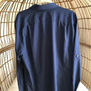 North End Sport dark blue button down shirt, New without tags. 100% polyester, size XL. Material is great for sweating, has a zipper pocket on the breast. Also has a company logo that can be covered up. The sleeves have the capability to be rolled up and buttoned. Over all great shirt, that just isn’t my husband’s style.