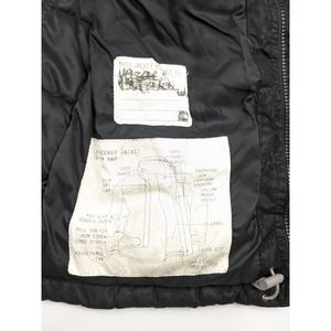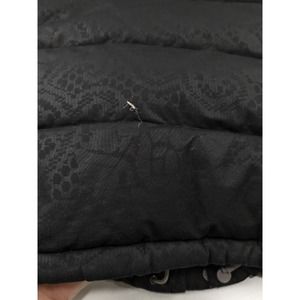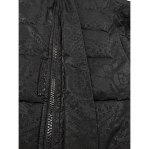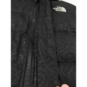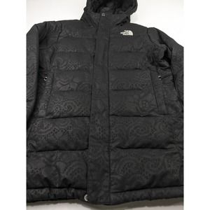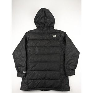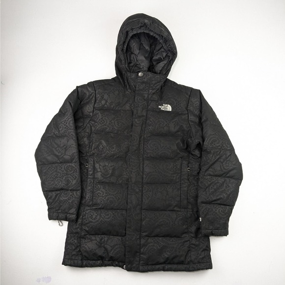 North Face 550 black patterned puffer coat (paisley looking pattern) longer length coat, size 14/16, good condition because name tag has been written on, two of the velcro strips on the zipper flap are missing and one is coming unstitched, there is also a small slit on the back of the coat (maybe 1/2 cm long) otherwise in very good condition!
