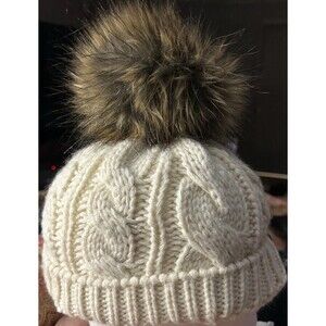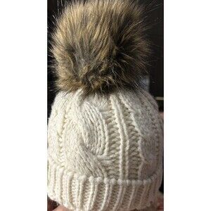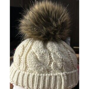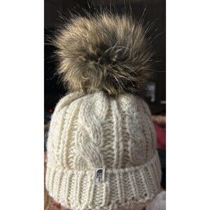 North Face Beanie Youth One Size Off White Brown Chunky Knit Pom Pom Ski Lodge