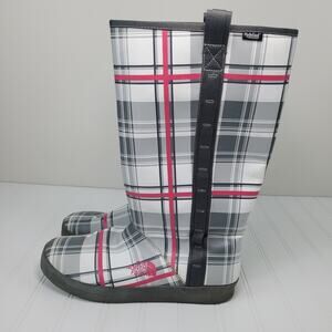 The North Face women’s size 11 Hydroseal tall rain boots in red, gray, and white plaid print