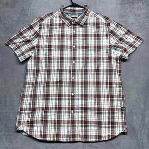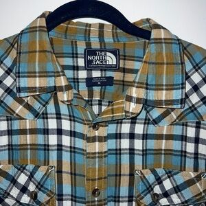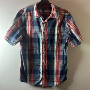 The North Face Button Up Camp Shirt. Made with a lightweight fabric, this shirt features a plaid check pattern in a multicolor design, perfect for a casual wear or travel. The short sleeves, collared neckline, and button closure add a classic touch to this button-up shirt from a trusted brand. One zip-close chest pocket.