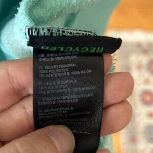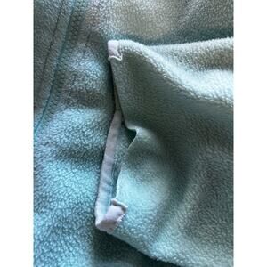 Good condition, however the trim on one sleeve has missing lining. See photo. The trim is sewn down and will not continue to fall apart. Mint green fleece, grey contrast nylon. Long sleeve, full zip.