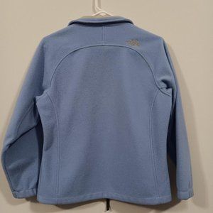 This periwinkle The North Face fleece zip-up jacket is perfect for cold weather! Thie fleece is a size youth large but fits well for any petite or small adult. The North Face fleece jacket has been lightly worn.