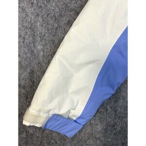 Detachable hood. Some light stains along the right sleeve and left shoulder area. One light stain shown next to the size tag on the inside.
