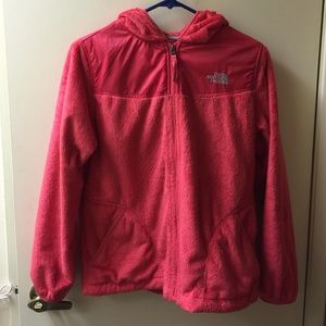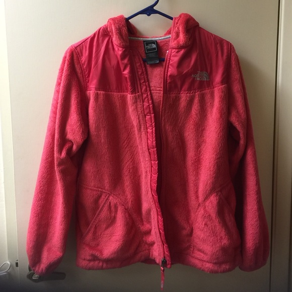 Pink jacket. Super warm and soft. Hooded. The zipper works perfectly and there are no stains. Worn to Europe for vacation and never worn again. Is a girls XL but fits like a women's S. I'm 5'6" 120 lbs and its fits me perfectly.