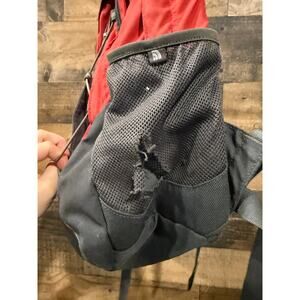 North Face Jester Backpack- Red/Gray. Features multiple zippered compartments, padded straps and front bungee cord storage. Good condition, minor tear is side mesh pocket that can easily be repaired. This backpack is durable and reliable for school, hiking or everyday use. Gently used, cleaned and ready for the next adventure. Great value!!