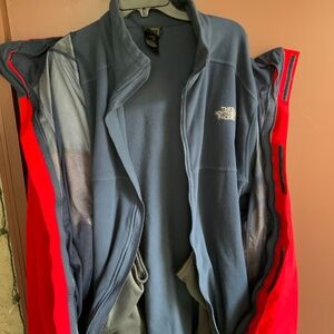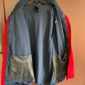 Red and black hooded shell over a grey fleece inner jacket. You can wear just the inner jacket, just the outer jacket, or both together giving you the three climates of the Antora triclimate jacket. Looks like it would be very comfy and warm. It’s the kind of bold design that people like and will tell you that they like it.