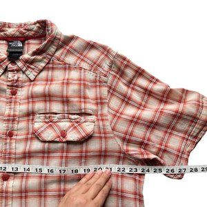Stylish North Face men's shirt in XL size, crafted from 100% cotton. The red plaid check design is a classic choice for casual wear. It features short sleeves and a button-up style for easy wear.