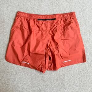 The North Face orange swishy men’s running shorts with inner drawstring and back zip pocket. Reflective stripes for safety on the back of the legs.