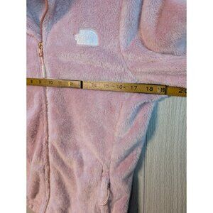 The North Face Osito Jacket is a women's small pink fleece jacket with a relaxed fit and a full zip closure. Made of polyester fleece, this mid-length jacket is ideal for travel and casual occasions. The geometric pattern and embroidered logo accents add a stylish touch to this lightweight and lined jacket, perfect for all seasons including winter, fall, and spring. With convenient pockets and a versatile design, this North Face jacket is a must-have for outdoor and nature-themed outfits.