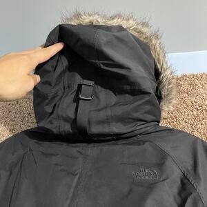 Features: Detachable faux fur trim on hood, two zippered hand pockets, interior waist cinch, double closure with zipper and snap placket, North Face logo embroidered on chest and sleeve, adjustable back hood strap, rear snap vent, and full-length parka style coverage for warmth.