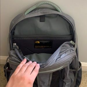 Dark gray with light blue accents, super cute pretty warn on the back but still in great condition. Very spacious and perfect for school or travel