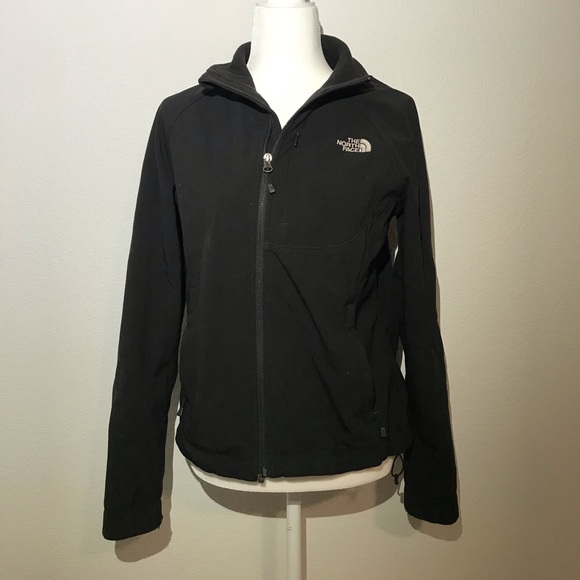 Black North Face jacket shell with soft interior. Water repellent material. Shows some wear if you look closely.