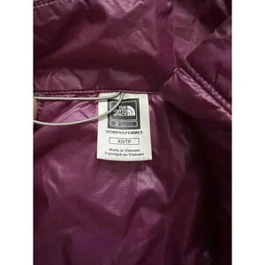 Stay warm and stylish with this purple and black puffer jacket from The North Face. The jacket features a full zip closure, long sleeves, and a short length. It is made with a softshell fabric type and is perfect for all seasons, including winter, fall, and spring. The North Face Pertex Quantum Jacket is designed for women and comes in size XS. It is machine washable and features a logo accent. The jacket is ideal for casual occasions and is not handmade. The product line is The North Face Primaloft, and the theme is running.