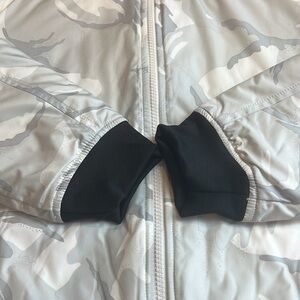 This jacket is in great preowned condition.Perfect for the fall or winter months. Camouflage, camo, military, white, snow. Front zipper closure. Small zip pocket on upper left sleeve. Length: