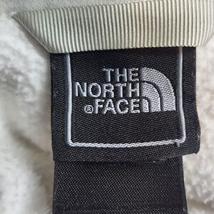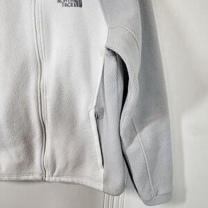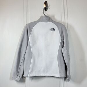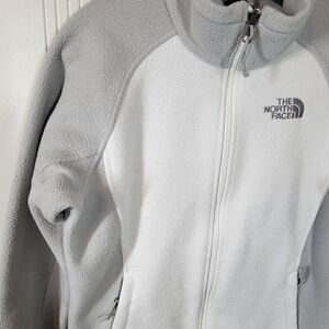 North Face women's white & gray fleece jacket. Size small / petite. Very nice jacket...one very small mark on the inside of the zipper area...as shown in the last photo.