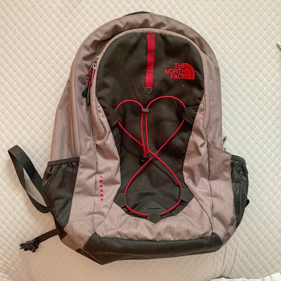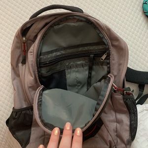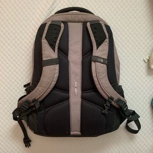 This is the jester version of the North Face book bag and has been gently used. It’s a pretty lavender color with hot pink accents. It has two pockets. The smaller has places for pens, sticky notes, etc. and the big pocket has a place for a computer. Plus, there are cup holder on each side.