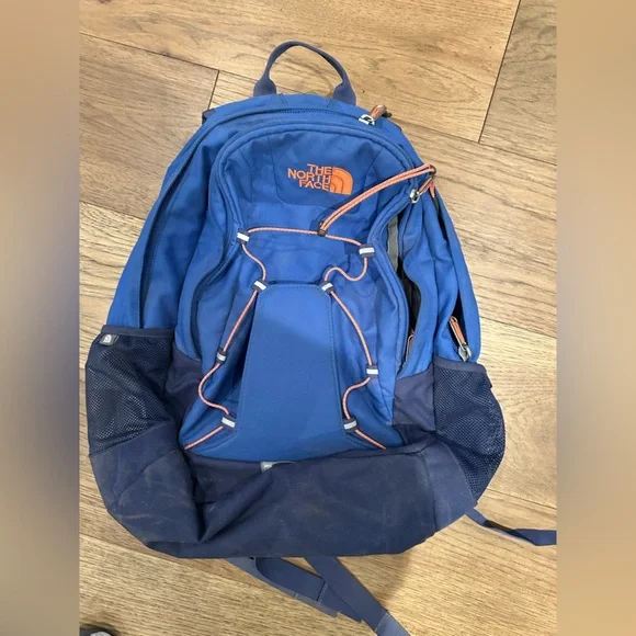 Blue with coral drawstring North Face Borealis nylon backpack. Pockets are a navy mesh. Needs to be wiped clean - a little dusty from storage but still in great condition.