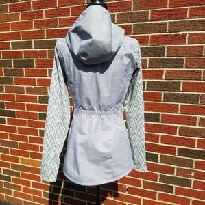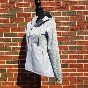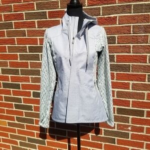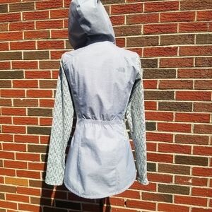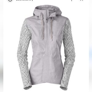 North Face dyvinity gray zip-up hooded jacket with asymmetrical bottom snap cloth sleeves and side panel front pockets thumb hole sleeves jacket is longer in the back size small measurement of length from top of shoulder to the bottom of him line in front of jacket 24 measurement of the top of the shoulderto the bottom of the hemline in the back of jacket 29 armpit to armpit 18 waist side to side 15 sku. Cpm a9001