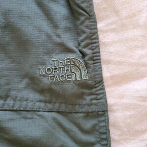 The North Face 100% nylon hiking pants in dark olive green. Color is most accurate in picture showing pants hanging.