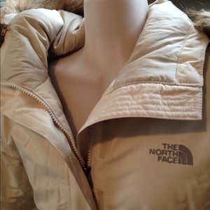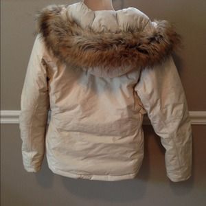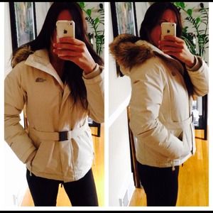 Cream colored hooded down North Face with removable fur around hood. Attached belt clasps in front and zipper pocket on inside with opening for headphone cord. Super warm and cozy!!