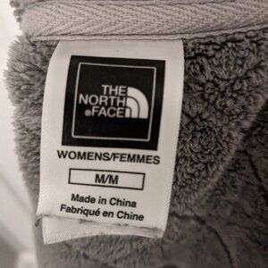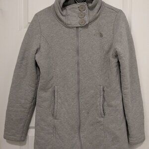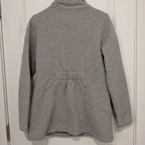 This fleece has been worn but is in good condition. The neck is high when buttoned. The coat itself is long and hits at the mid to upper thigh. Has a plushy lining and front pockets.