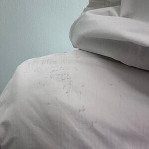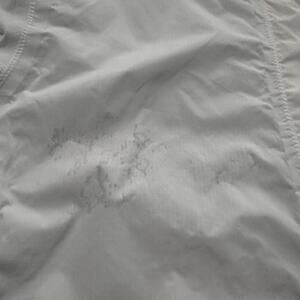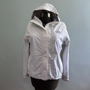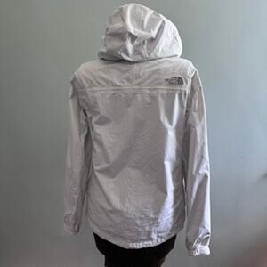North Face white windbreaker rain jacket, size M. Does have several discoloration spots, see photos. Previously loved and in good used condition. Non smoking and pet free house.