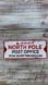 The North Pole Sign is a decorative rectangular sign made of distressed white metal. The sign is decorated with a red border and art of Santa’s sleigh with reindeer, and reads “North Pole Post Office”, “Special Delivery to Santa Clause” in stamped red and gray lettering. Display this sign propped upon a tabletop or shelf, or hang on a wall using the two drilled nail holes on either end. Measures 4.75” high by 11” wide.