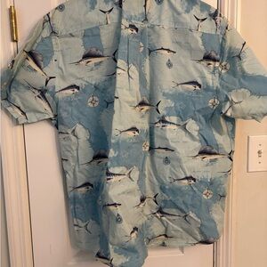 Embrace the ocean vibe with the North River Men's Shirt, featuring a captivating marlin print. This blue shirt is perfect for casual outings and adds a nautical touch to your style.