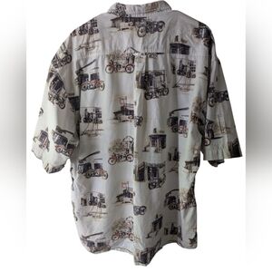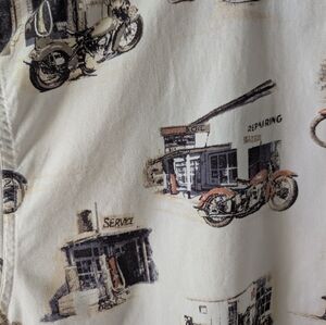 Explore timeless style with this men's button down vintage print shirt in cream. Motorcycle print all over the shirt. Perfect for casual outings or any motorcycle enthusiast. Left chest pocket.