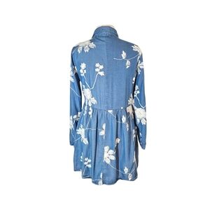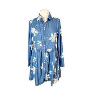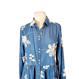 NorthStyle chambray tunic with white embroidered floral pattern. Soft and drapey, with pairs of buttons down the front, long sleeves with button cuffs, and front pockets, this can be worn as a tunic mini dress or top.