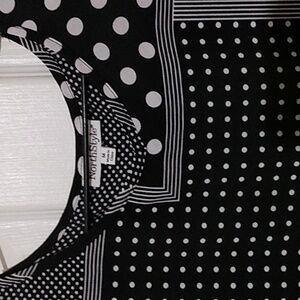 North Style womans top sz M, scoop neck,qtr length sleeves with ties, lots of various polka dots. Seems to be polyester fabric (no lable).