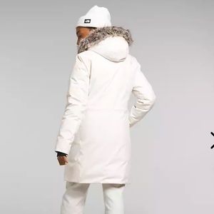 Whitish/cream Parka. Great condition. Some black scuff marks from general city commuting that you could work out. Fur lined hood.