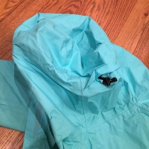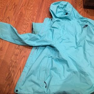 North face rain jacket perfect condition brand new turquoise color pockets on the inside and outside also pockets on the sleeves adjustable sleeves and adjustable hoodie and adjustable waste band. Medium size