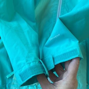 Shell is thicker than a windbreaker but not lined with fleece or down. Adjustable drawstring at waist through pockets. Pockets zip. No rips or holes. Still looks great outside with just a few marks—nothing outside of normal recess wear. Came with fleece liner which my daughter wore more than the jacket. Excellent condition. North face size XXS