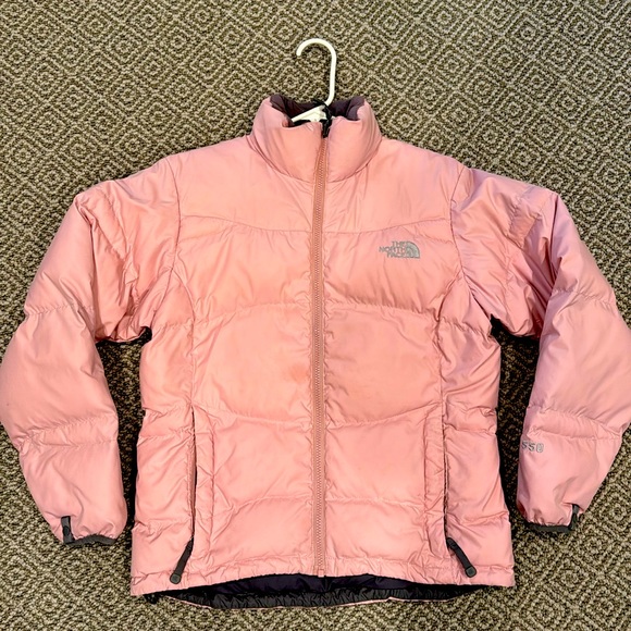 Pink puffer jacket by the NorthFace. Bubblegum pink with gray lining, lined in more of a soft fuzzy material at the neck. Front zipper pockets. Size small.