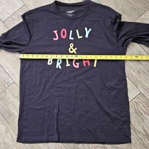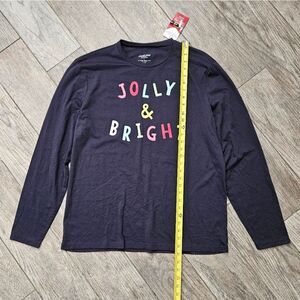 Navy blue long sleeve crew neck shirt with Jolly & Bright in colorful print on the front