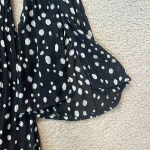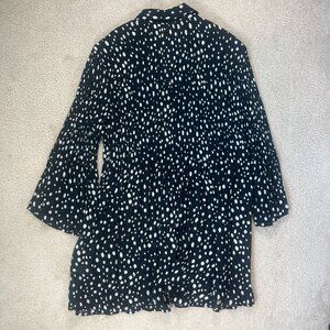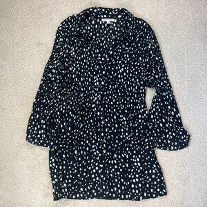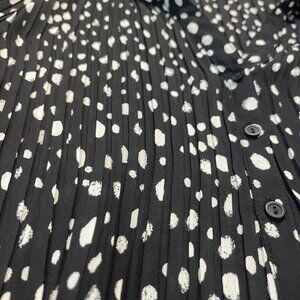 Chic NorthStyle tunic top featuring a black-and-white abstract polka dot print with pleated detailing. Designed with a collared neckline, button front, and flowy 3/4 bell sleeves for a comfortable yet polished look. Lightweight and versatile. Can be dressed up for work or worn casually with leggings. Size 1X. Excellent pre-owned condition with no visible flaws.