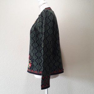 Black with green jacquard print and red/cream/green tyrol style floral embroidery