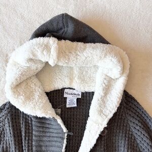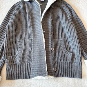 Northstyle button front hooded sweater jacket. Features pockets and a Sherpa inside.