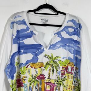 NorthStyle Pullover Tunic Top Women Sz 2X White Beach Resort Print 3/4 Sleeve
