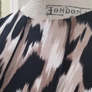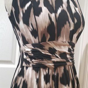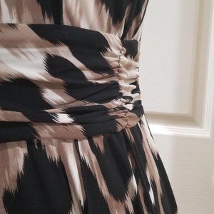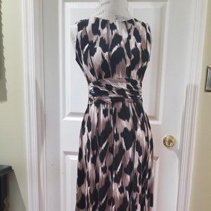 NorthStyle - Sleeveless, ruched waist dress. Ikat-style print. Ruching at front waist. Exposed-seam panels fit at the bodice then flare to the hem. No wrinkle, polyester + spandex fabric. Suitable to pack for travel. Make an offer.