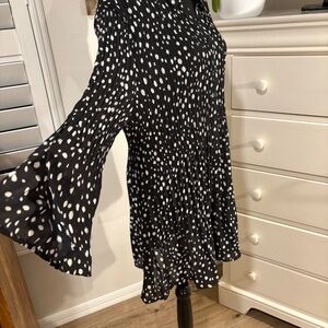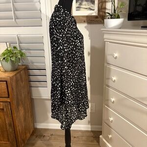 Dot print, with mini-pleats through the bodice that release to a flared hem. Full button front and top-pleated long sleeves that open into slightly belled cuffs with slits.