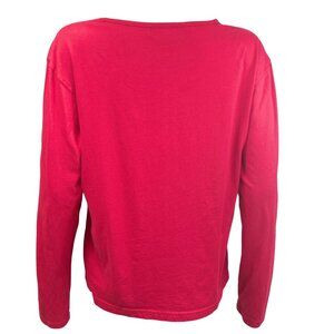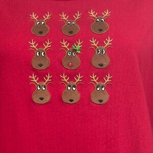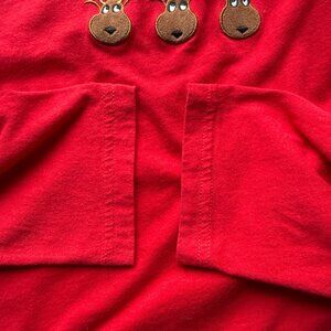 Bright red cotton shirt with fun embroidered reindeer graphics on the front. Crew neckline and long sleeves. Comfortable loose fit for festive occasions. Pre-owned in good condition.