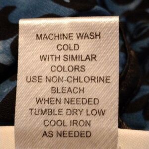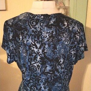 Pretty arabesque graphics in black on blue. Black, satiny trim radiates from the left side. Fit and flare shape. Flippy skirt. Size 18 measures 44 at chest, 34 at waist, 52 at hips, 44 long from shoulder to hem. Soft and flowy with a dancing skirt.