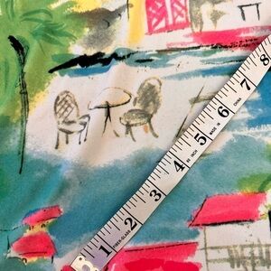 Vibrant coastal European seaside scene. Turquoise, yellow, green, pink, novelty print