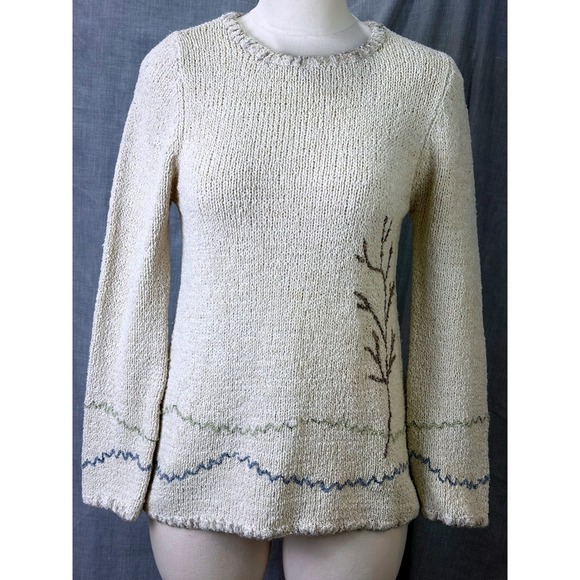Northern Isles Cream Textured Silk Blend Knit Sweater Branch Embroidery Small