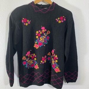 Northern Isles Portraits Womens Hand Knit Black Size Large Floral Sweater Warm