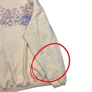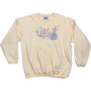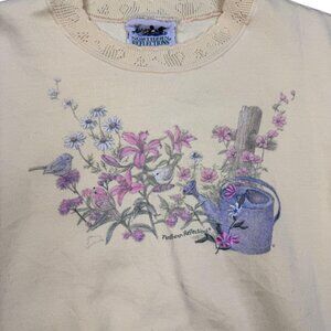 Vintage Northern Reflections cream pullover sweatshirt with pastel floral graphic and purple watering can design. Cozy fleece lining with lace-like trim at the neckline and cuffs. Classic 90s cottagecore aesthetic. Women’s Large.