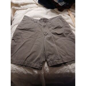 The product is a pair of Northface chino shorts in grey, marked size 36 but measuring 34 inches. Made of cotton twill fabric with a light wash, these classic-fit shorts feature a flat front design with pockets. Perfect for casual occasions, these chino shorts have a solid gray color and are designed for outdoor style. The North Face brand ensures quality and durability in this wardrobe essential for men.